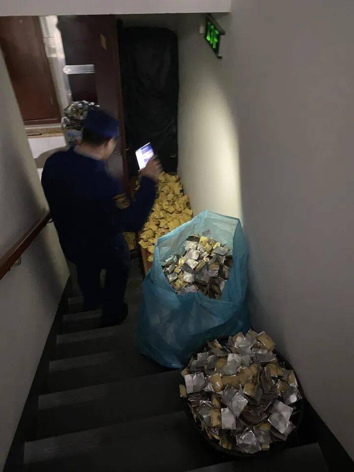 在现场,检查人员随即对这些杂物进行清理,并发现很多居民将祭祀焚烧纸钱堆放在楼道上。