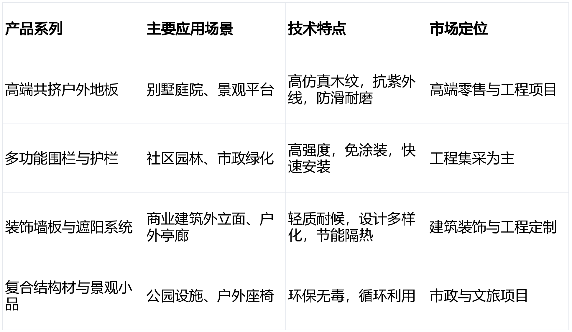 美新科技在招股书中详细披露了其“研发驱动+垂直整合”的战略架构。公司持续投入共挤技术、耐候助剂体系、表面质感处理等核心工艺,构建了多层次的产品矩阵,覆盖户外地板、护栏、墙板、景观设施等多个应用场景。其产品不仅在国内高端项目中广泛应用,还远销欧美、澳洲等对环保标准要求严格的海外市场。